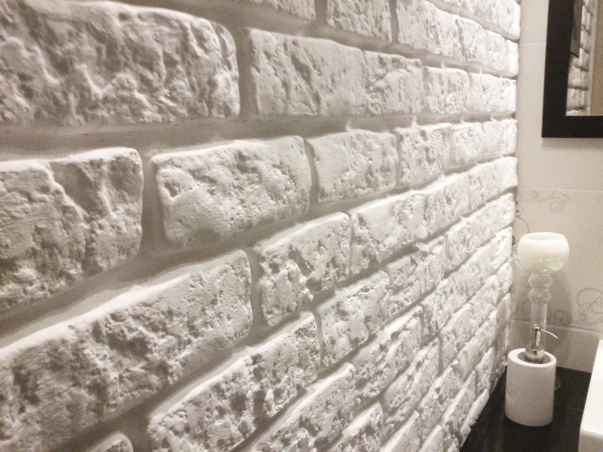 Po przyklejeniu na ścianę płytki ze starą cegłą można malować na dowolny kolor, wybraną farbą przeznaczoną do wnętrz.